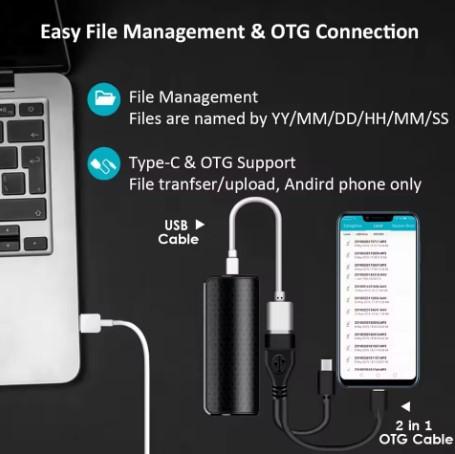 • Якщо ви хочете прослухати записи, у вас є два варіанти. Просто підключіться до комп'ютера, щоб слухати аудіофайли, або використовуйте кабель OTG, що додається, для прослуховування на пристрої Android з підтримкою OTG, включаючи смартфони та планшети (користувачам iPhone знадобиться комп'ютер).