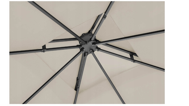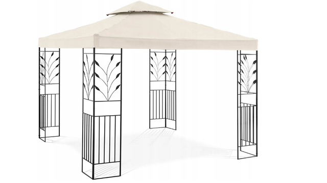 Захист від УФ-випромінювання та водонепроникність є перевагами поліестерової оболонки. Матеріал вагою 180 г/м2 має високу міцність. Також має гарний кремовий колір. Розмір інтер'єру павільйону (3 х 3 х 2,6 м) підійде багатьом гостям, які неодмінно будуть у захваті від його разючого характеру – каркас прикрашений квітковим мотивом. Прикрасивши її гірляндами з підсвічуванням або ліхтариками, альтанка зробить вечірню зустріч привабливішою.